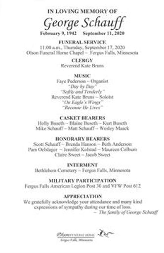 George is survived by his, son, John (Marcia) Schauff of Underwood; granddaughters, Ashley Schauff of Fergus Falls and Allison Schauff of Underwood; siblings, Dick (Barb) Schauff of Fergus Falls, Judy Buseth of Fergus Falls, and Jerry (Dini) Schauff of Elizabeth; sisters-in-law, Ann Ness of Northfield and Gloria (Jack) Sweet of St. Paul; and uncle, Paul Schauff of Fergus Falls; as well as numerous nieces, nephews, and many other relatives and friends.